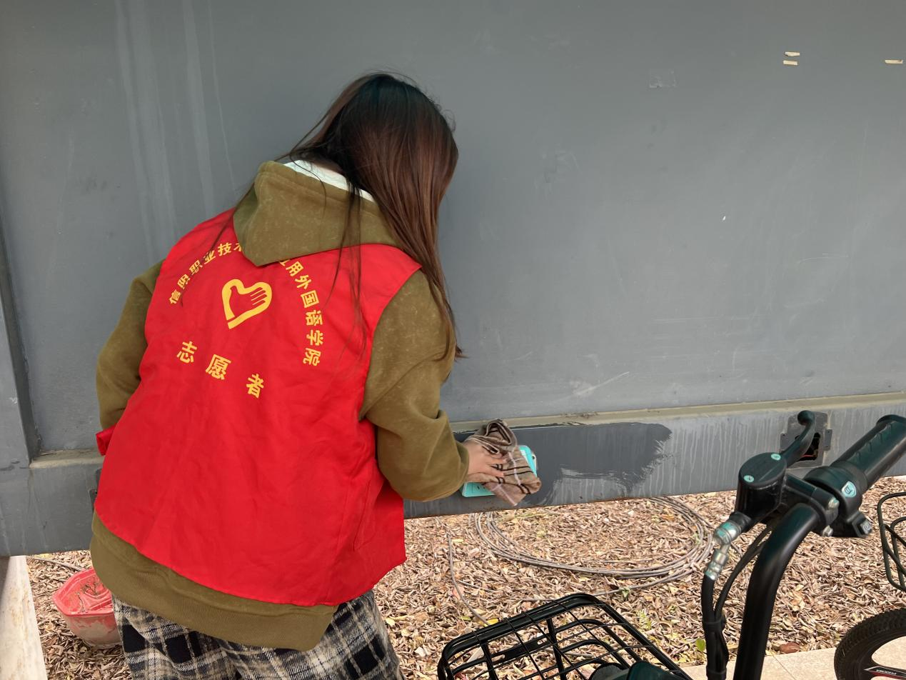 活动地点在学校龙飞苑小区,负责人分发志愿服并布置需要完成的任务后,同学们立即开始卫生清洁行动。同学们分组分工,擦洗各单元充电桩和标识牌灰尘、捡拾烟头、打扫地面卫生、清理水池内的落叶,相互配合共同完成任务,充分展现了公司员工不怕脏、不怕累、志愿服务我当先的奉献精神。