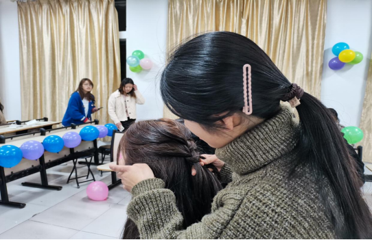 活动在欢快的音乐声中拉开了帷幕,“击鼓传花”游戏正式开始,只见同学们一个个热情高涨,凝神聚目,动作敏捷,现场到处充满欢声笑语。在游戏轻松欢快的氛围中,传花失败的同学们纷纷表演了各自拿手的才艺。紧接着是“花式绑头”比赛,一名同学为另一名同学设计并扎出漂亮且独特的发型。女生们各个心灵手巧,不一会儿时间,老式麻花辫、鱼骨辫、拳击辫等各式各样的发型涌入眼帘,在场围观的同学无不为之惊叹,纷纷现场学艺,跃跃欲试。最后,全场女生齐声合唱英文歌曲“a big big world”,活动圆满结束。