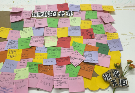 这一天的3377体育处处充满爱的气息。有的班级同学们在上课前集体向任课教师表达爱意:“老师,您辛苦了!祝您节日快乐!”有的班级精心布置了班级心愿墙,同学们将自己想要对老师说的话写在便签纸上并贴在心愿墙上,由班长带领任课老师进行参观,满满一墙的感谢话也道不尽同学们对老师的敬爱。还有的班级为老师们准备了惊喜与满满的仪式感,为老师们献上一束美丽的鲜花和圆圆的月饼。