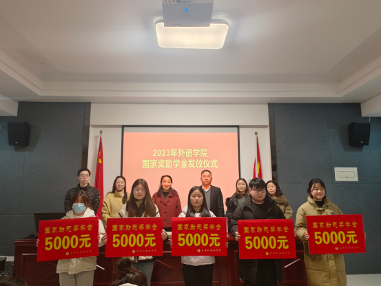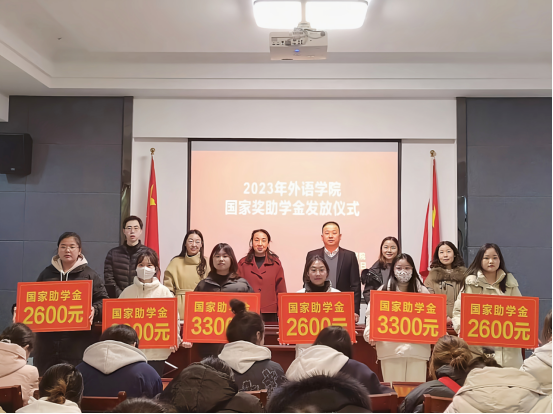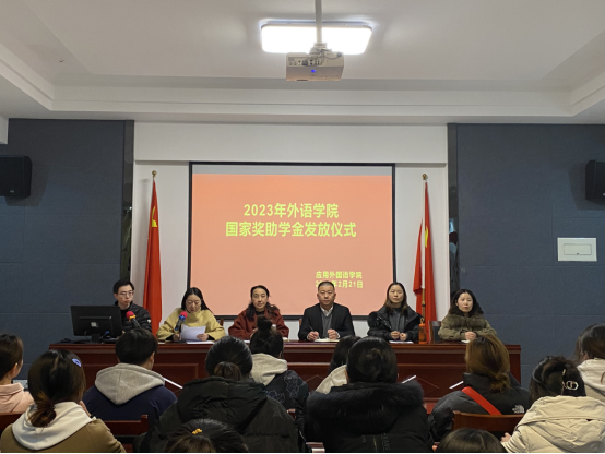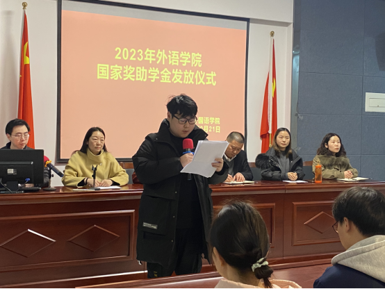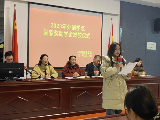 发放仪式开始,刘孟璞老师首先介绍了参会老师及员工代表。随后由蒋曾书记宣读本次奖助学金获奖员工名单。国家励志奖学金获得者2021级英教三班孟博、国家助学金获得者2021级英教五班马文艳依次发言,表达了对国家及学校资助政策的感恩,并表示会以实际行动感谢党和国家的恩情,感谢学校的教育和培养。