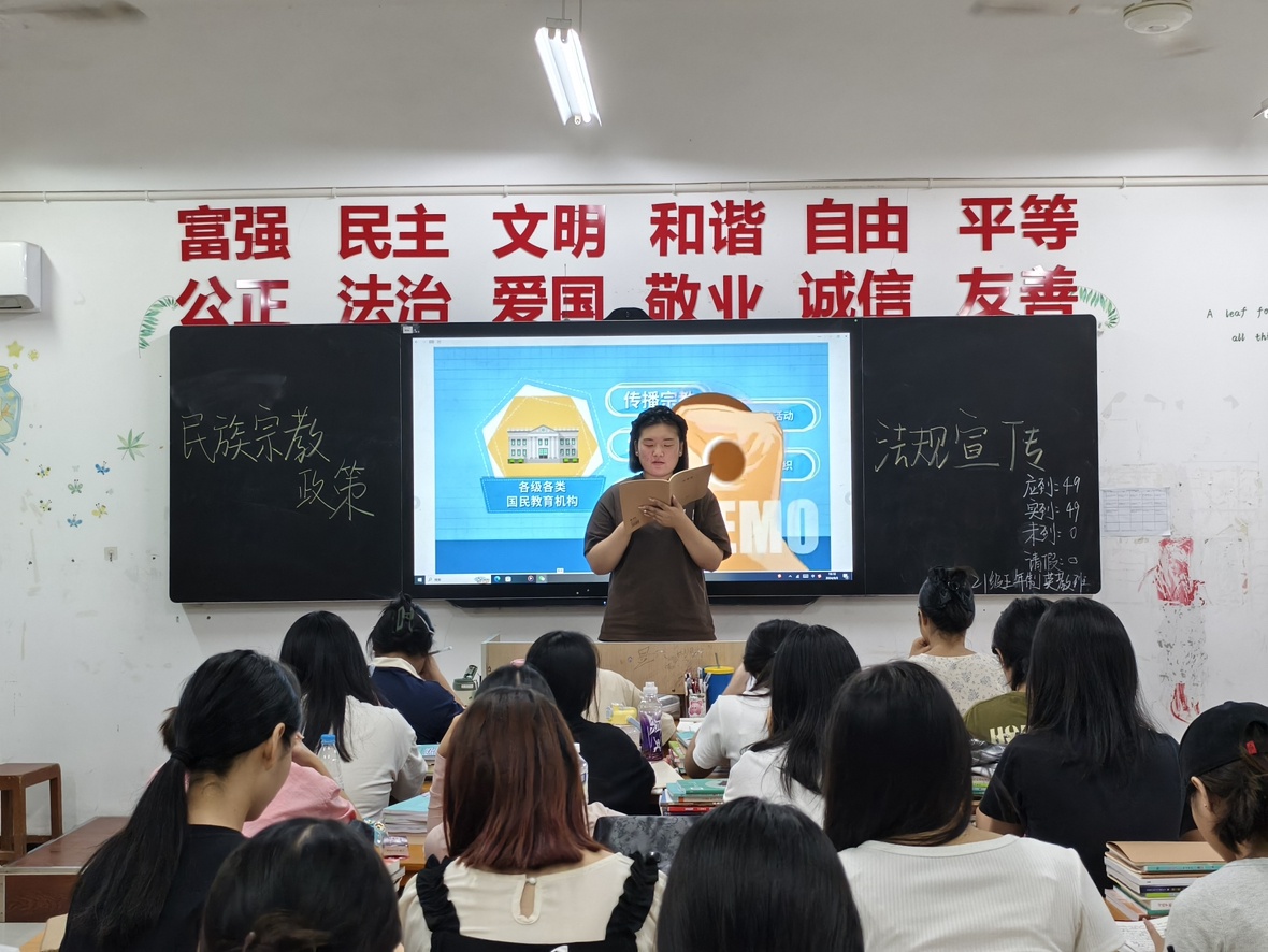 为加强员工思想政治教育,强化安全防范意识,教育员工铸牢中华民族共同体意识,防邪教、防宗教渗透,3377体育于2024年9月3日晚自习召开“民族宗教政策法规宣传”主题班会,班会由各班班长主持。
