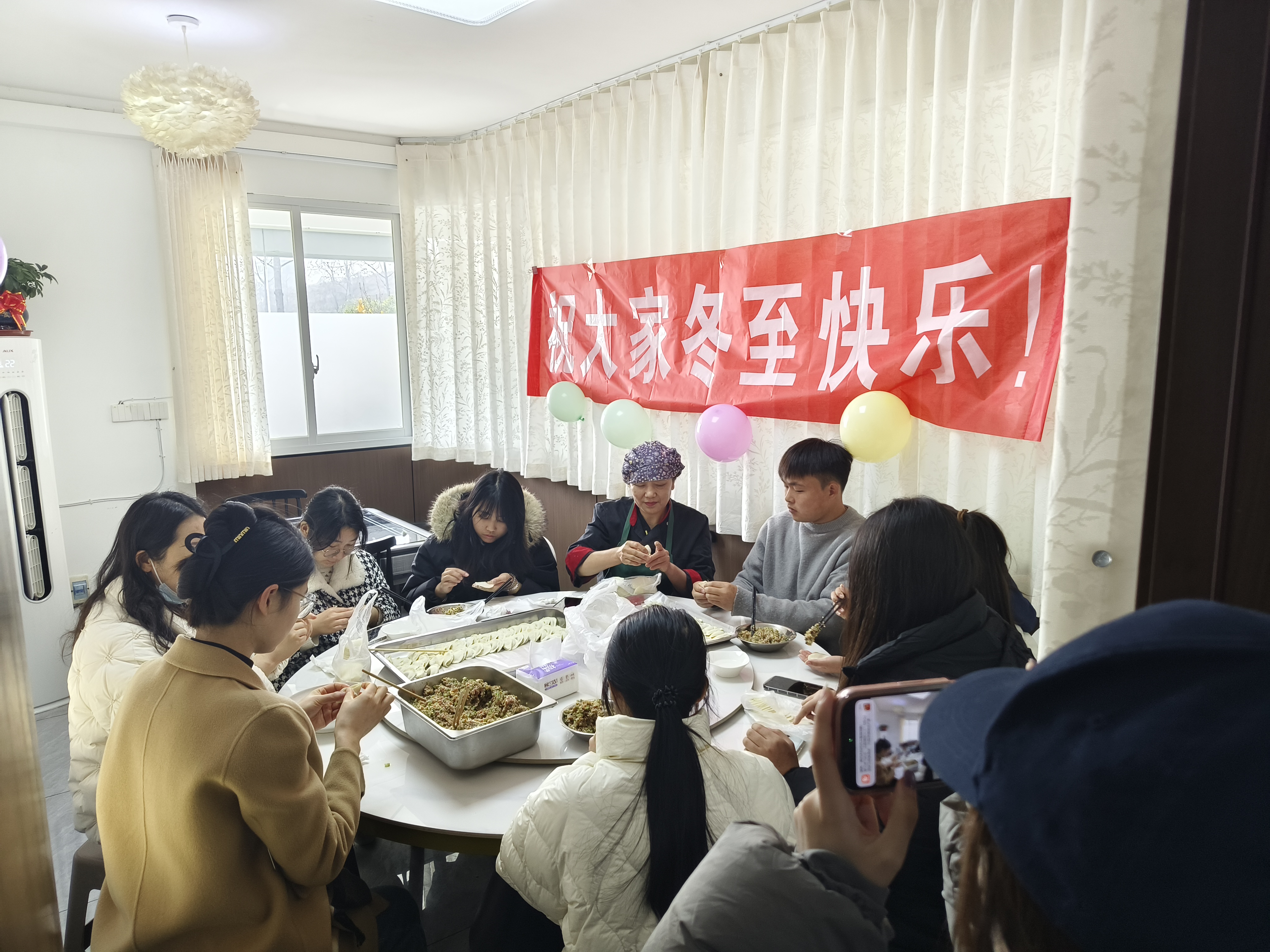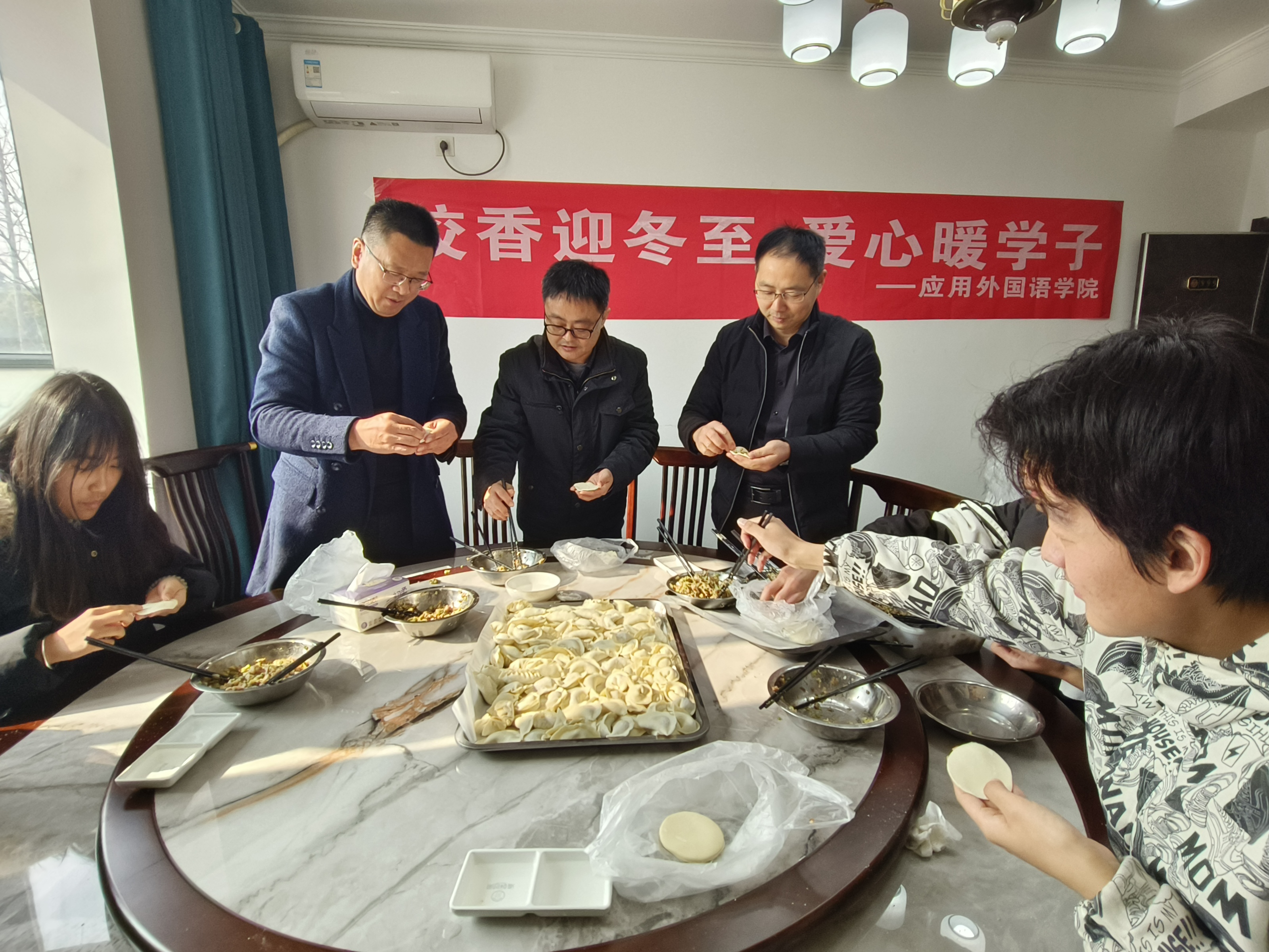 活动现场暖意融融,欢声笑语不断。老师们与同学们分工协作,专业厨师现场指导包饺子,忙得不亦乐乎。大家亮出各自的拿手绝活,形态各异的饺子摆满托盘,有圆润饱满的元宝饺,有精巧别致的月牙饺,每一个饺子都包裹着浓浓的情谊。在等待饺子煮熟的间隙,员工会干部还举行了冬至习俗知识问答,大家踊跃抢答,在互动中加深了对冬至传统节气的了解。当热气腾腾的饺子端上桌,大家围坐在一起品尝美食,分享生活趣事,暖流在每个人的心间流淌。