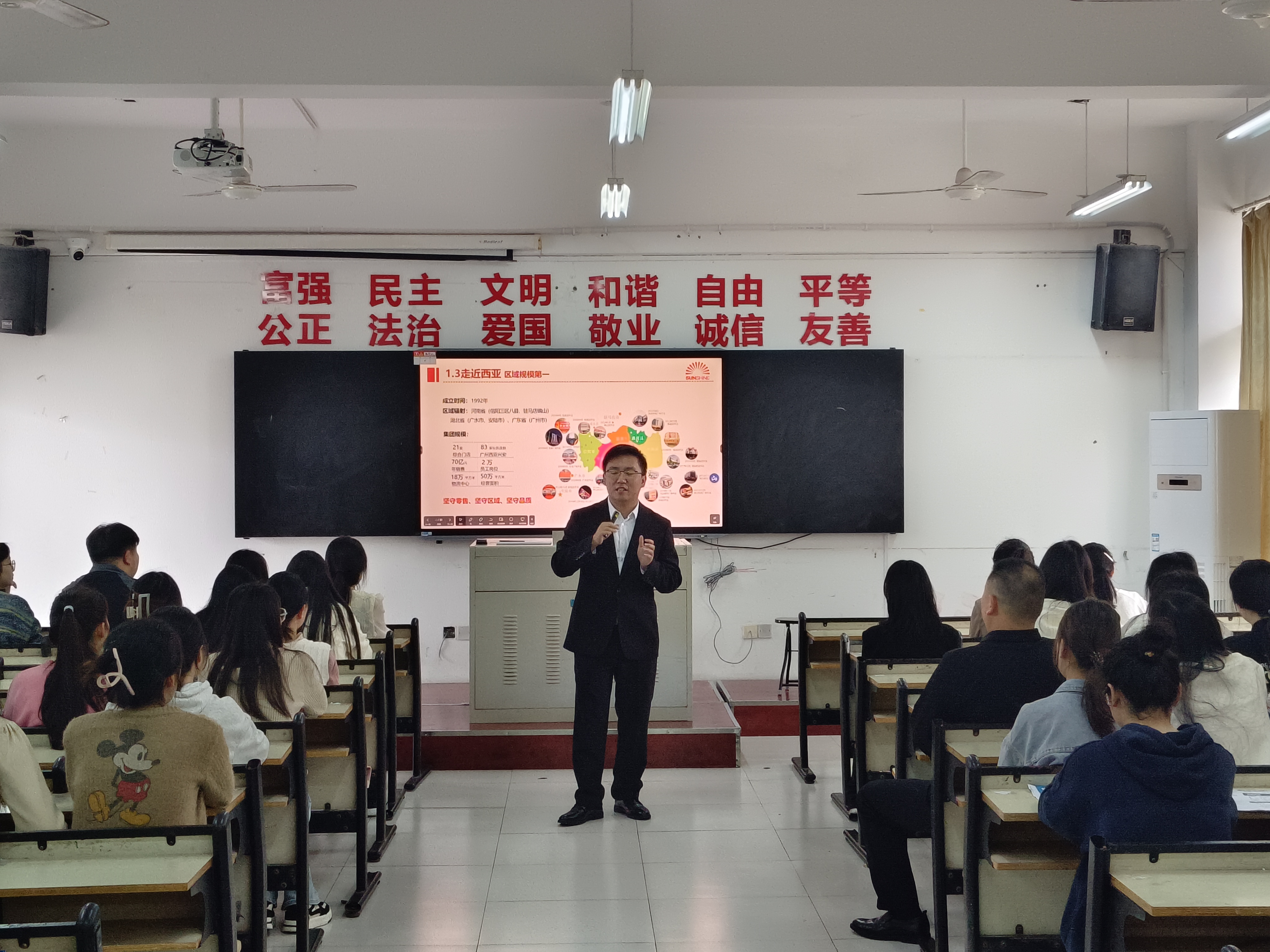 首先,西亚和美公司招聘专员闵经理就公司的理念、主营业务、发展情况等给同学们做了详细的介绍。同时,耐心解答了同学们最关心的岗位待遇和发展空间等问题。经过深入的沟通交流,许多同学踊跃添加企业的联系方式并登记相关信息。其次,河南牧尚文化传播公司的工作人员给同学们介绍了企业文化、用工信息和薪资待遇等情况,并诚挚邀请同学们去公司参观。经过充分互动,不少同学对该公司表现出极大的兴趣。最后,张泽锋结合两家公司的招聘宣讲发表讲话,建议同学们转变就业观念,先就业再择业,鼓励同学们结合自身的优势和特长寻找适合自己的工作,同时预祝同学们求职顺利,找到称心如意的工作。